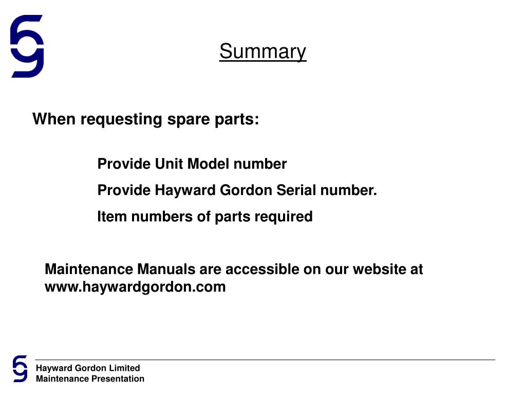 Summary When requesting spare parts: Provide Unit Model number Provide Hayward Gordon Serial number. Item numbers of parts required Maintenance Manuals are accessible on our website at www.haywardgordon.com