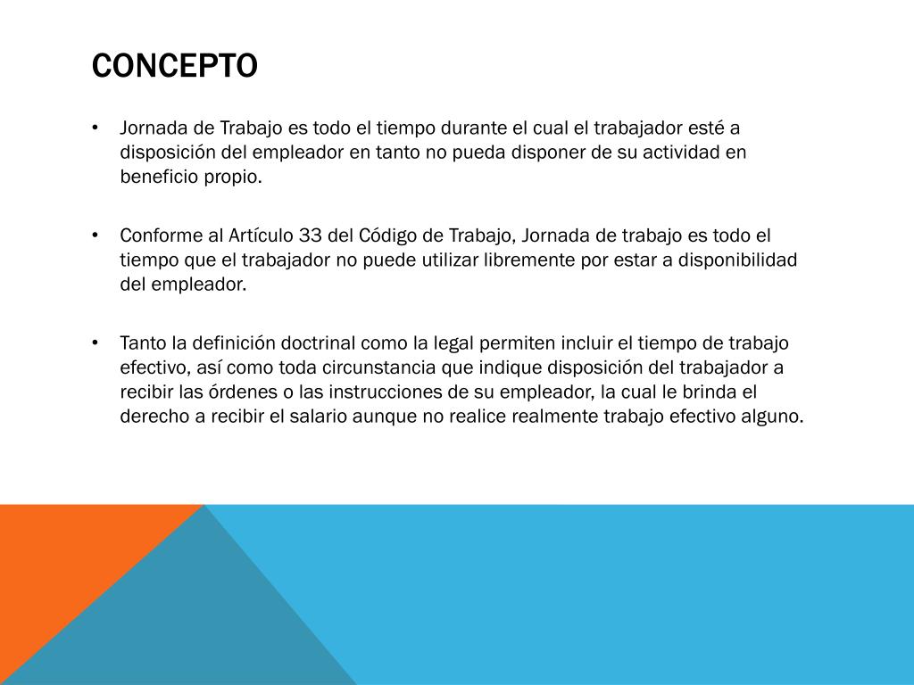 Concepto • Jornada de Trabajo es todo el tiempo durante el cual el trabajador esté a disposición del empleador en tanto no pueda disponer de su actividad en beneficio propio. • Conforme al Artículo 33 del Código de Trabajo, Jornada de trabajo es todo el tiempo que el trabajador no puede utilizar libremente por estar a disponibilidad del empleador. • Tanto la definición doctrinal como la legal permiten incluir el tiempo de trabajo efectivo, así como toda circunstancia que indique disposición del trabajador a recibir las órdenes o las instrucciones de su empleador, la cual le brinda el derecho a recibir el salario aunque no realice realmente trabajo efectivo alguno.