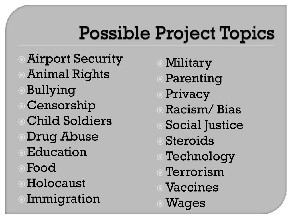 Possible Project Topics • Military • Parenting • Privacy • Racism/ Bias • Social Justice • Steroids • Technology • Terrorism • Vaccines • Wages Airport Security Animal Rights Bullying Censorship Child Soldiers Drug Abuse Education Food Holocaust Immigration