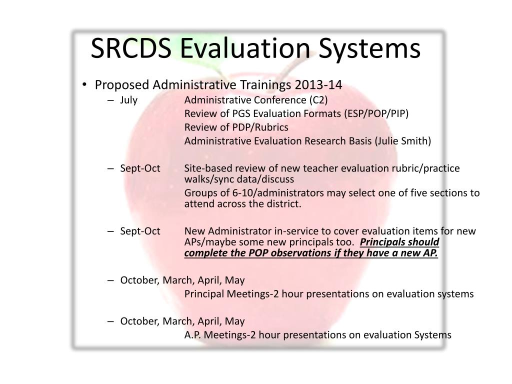 SRCDS Evaluation Systems • Proposed Administrative Trainings 2013-14 • JulyAdministrative Conference (C2) Review of PGS Evaluation Formats (ESP/POP/PIP) Review of PDP/Rubrics Administrative Evaluation Research Basis (Julie Smith) • Sept-Oct Site-based review of new teacher evaluation rubric/practice walks/sync data/discuss Groups of 6-10/administrators may select one of five sections to attend across the district. • Sept-OctNew Administrator in-service to cover evaluation items for new APs/maybe some new principals too. Principals should complete the POP observations if they have a new AP. • October, March, April, May Principal Meetings-2 hour presentations on evaluation systems • October, March, April, May A.P. Meetings-2 hour presentations on evaluation Systems