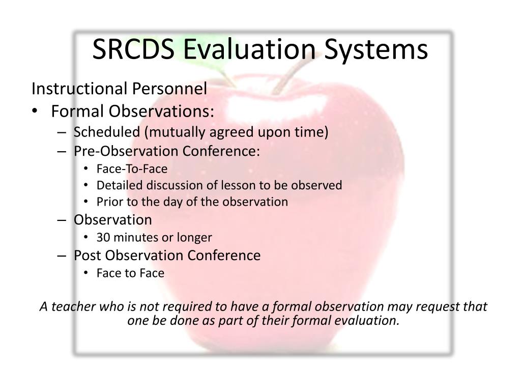 SRCDS Evaluation Systems Instructional Personnel • Formal Observations: • Scheduled (mutually agreed upon time) • Pre-Observation Conference: • Face-To-Face • Detailed discussion of lesson to be observed • Prior to the day of the observation • Observation • 30 minutes or longer • Post Observation Conference • Face to Face A teacher who is not required to have a formal observation may request that one be done as part of their formal evaluation.