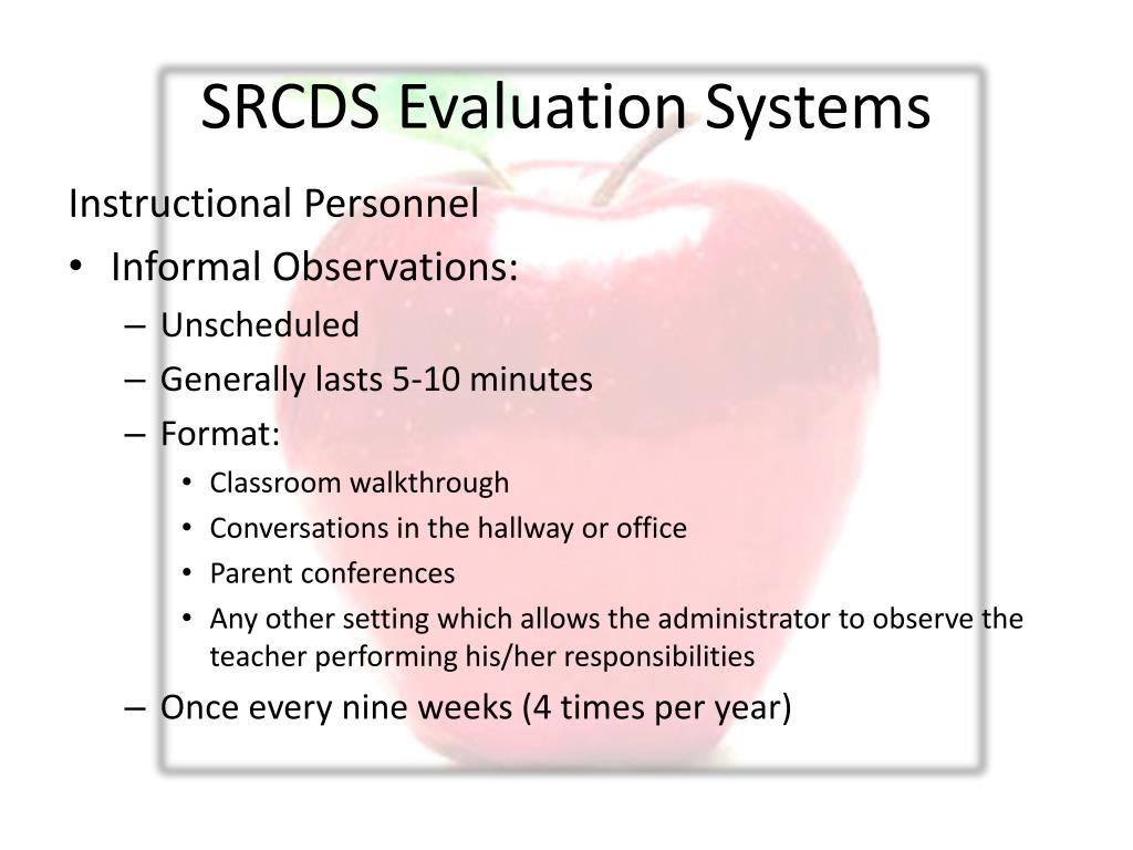 SRCDS Evaluation Systems Instructional Personnel • Informal Observations: • Unscheduled • Generally lasts 5-10 minutes • Format: • Classroom walkthrough • Conversations in the hallway or office • Parent conferences • Any other setting which allows the administrator to observe the teacher performing his/her responsibilities • Once every nine weeks (4 times per year)