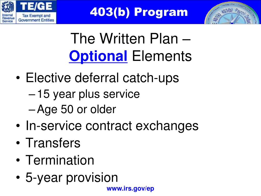 The Written Plan – Optional Elements • Elective deferral catch-ups • 15 year plus service • Age 50 or older • In-service contract exchanges • Transfers • Termination • 5-year provision
