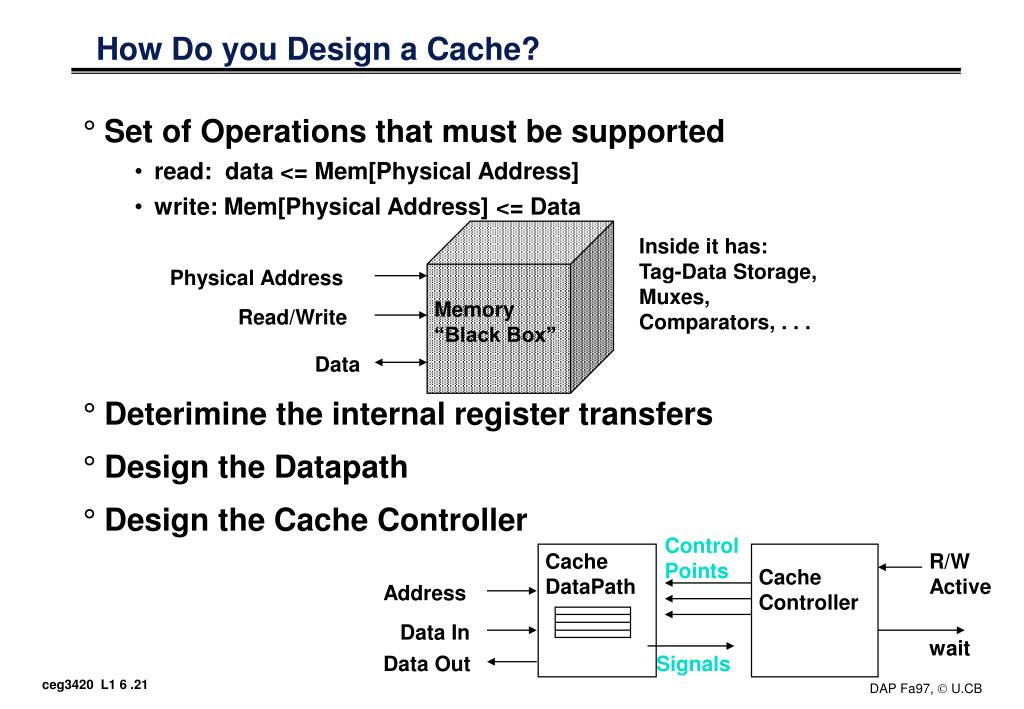How Do you Design a Cache? • Set of Operations that must be supported • read: data <= Mem[Physical Address] • write: Mem[Physical Address] <= Data • Deterimine the internal register transfers • Design the Datapath • Design the Cache Controller Inside it has: Tag-Data Storage, Muxes, Comparators, . . . Physical Address Memory “Black Box” Read/Write Data Control Points Cache DataPath R/W Active Cache Controller Address Data In wait Data Out Signals