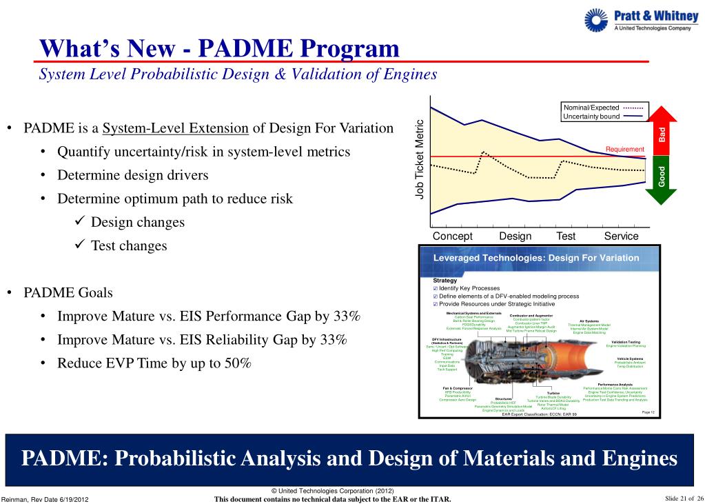 What’s New - PADME ProgramSystem Level Probabilistic Design & Validation of Engines • PADME is a System-Level Extension of Design For Variation • Quantify uncertainty/risk in system-level metrics • Determine design drivers • Determine optimum path to reduce risk • Design changes • Test changes • PADME Goals • Improve Mature vs. EIS Performance Gap by 33% • Improve Mature vs. EIS Reliability Gap by 33% • Reduce EVP Time by up to 50% PADME: Probabilistic Analysis and Design of Materials and Engines