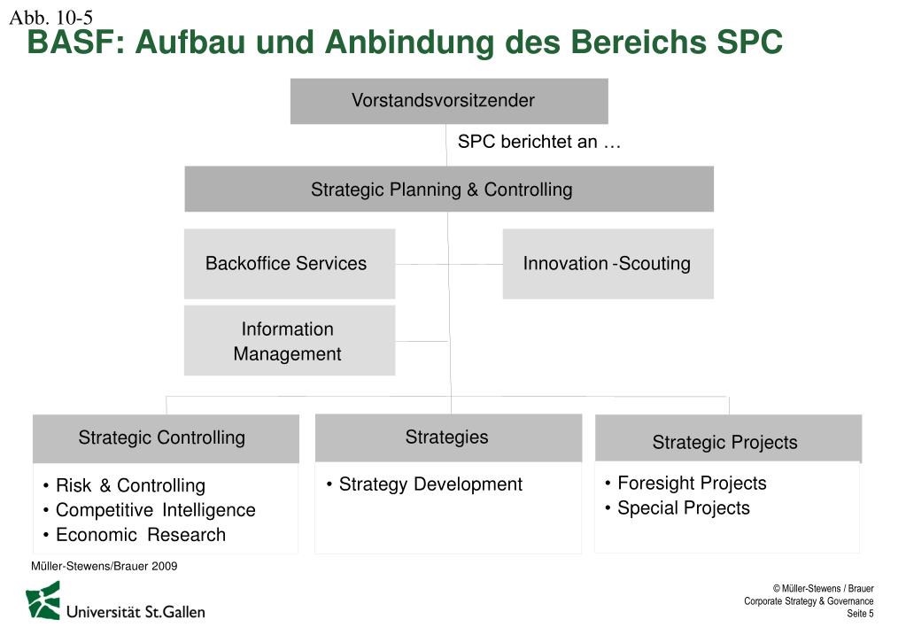 Abb. 10-5 BASF: Aufbau und Anbindung des Bereichs SPC Vorstandsvorsitzender SPC berichtet an … Strategic Planning & Controlling Backoffice Services Innovation - Scouting Information Management Strategies Strategic Controlling Strategic Projects • Foresight Projects • Strategy Development • Risk & Controlling • Special Projects • Competitive Intelligence • Economic Research Müller-Stewens/Brauer 2009