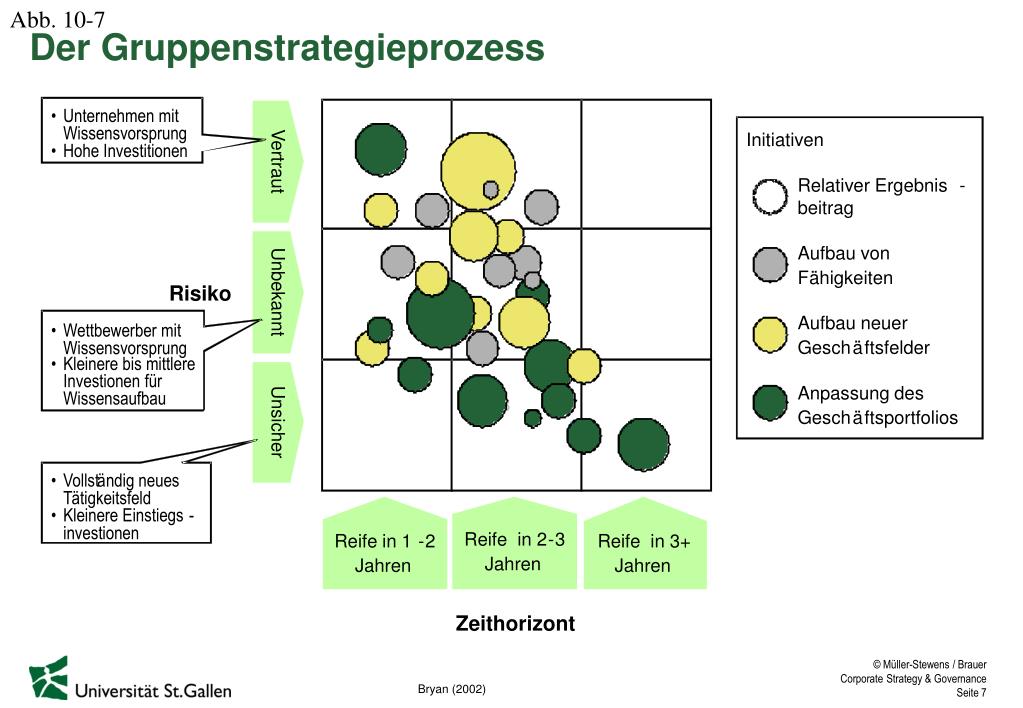 Abb. 10-7 Der Gruppenstrategieprozess • Unternehmen mit Wissensvorsprung Initiativen 1 • Hohe Investitionen Vertraut Relativer Ergebnis - beitrag Aufbau von 5 F ä higkeiten Unbekannt Risiko Aufbau neuer • Wettbewerber mit Gesch ä ftsfelder Wissensvorsprung • Kleinere bis mittlere Investionen für Anpassung des Wissensaufbau 8 Gesch ä ftsportfolios Unsicher • Vollst ä ndig neues T ä tigkeitsfeld • Kleinere Einstiegs - investionen Reife in 2 - 3 Reife in 1 - 2 Reife in 3+ Jahren Jahren Jahren Zeithorizont Bryan (2002)