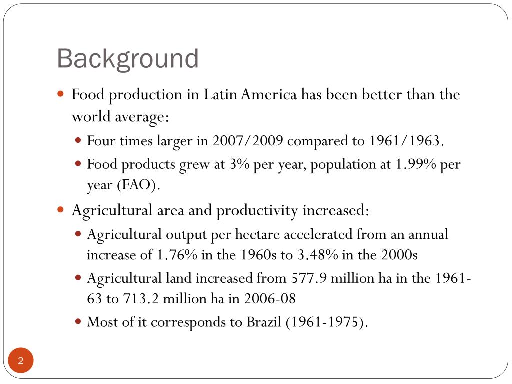Background • Foodproduction in LatinAmericahasbeenbetterthanthe world average: • Four times larger in 2007/2009 comparedto 1961/1963. • Foodproductsgrewat 3% per year, populationat 1.99% per year (FAO). • Agricultural areaandproductivityincreased: • Agricultural output per hectare accelerated from an annual increase of 1.76% in the 1960s to 3.48% in the 2000s • Agricultural land increased from 577.9 million ha in the 1961-63 to 713.2 million ha in 2006-08 • Most of it correspondstoBrazil (1961-1975).