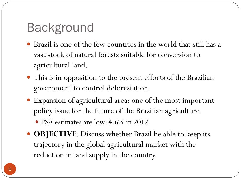 Background • Brazil is one of the few countries in the world that still has a vast stock of natural forests suitable for conversion to agricultural land. • This is in opposition to the present efforts of the Brazilian government to control deforestation. • Expansion of agricultural area: one of the most important policy issue for the future of the Brazilian agriculture. • PSA estimates are low: 4.6% in 2012. • OBJECTIVE: Discuss whether Brazil be able to keep its trajectory in the global agricultural market with the reduction in land supply in the country.