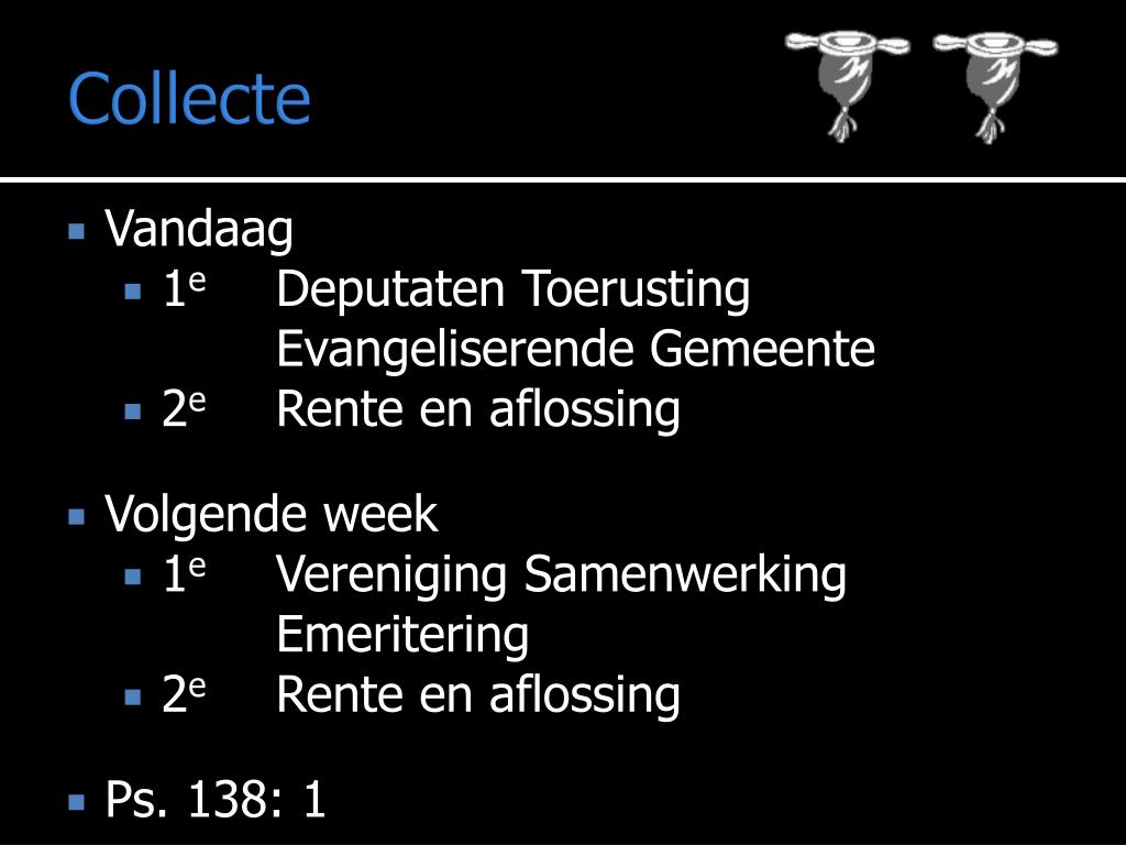 Collecte • Vandaag • 1eDeputaten Toerusting Evangeliserende Gemeente • 2e Rente en aflossing • Volgende week • 1eVereniging Samenwerking Emeritering • 2e Rente en aflossing • Ps. 138: 1