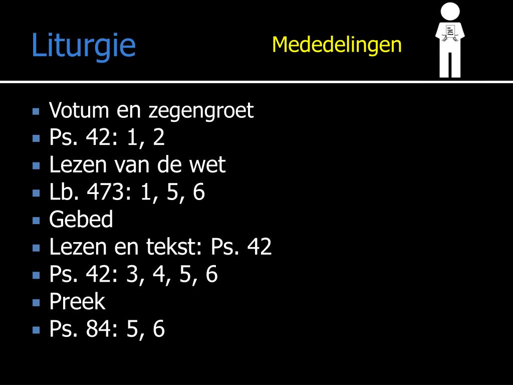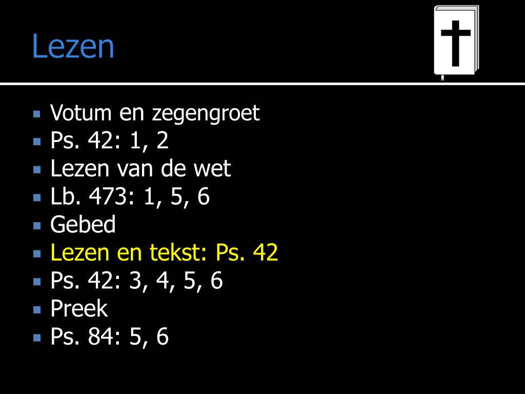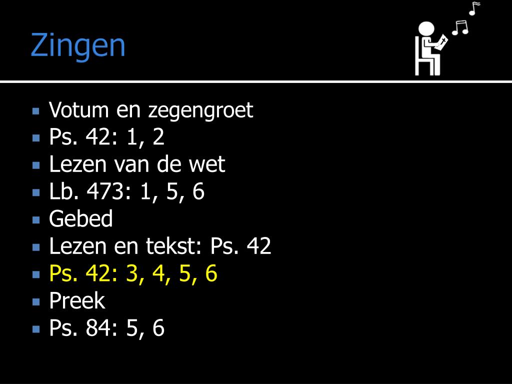 Liturgie Mededelingen • Votum en zegengroet • Ps. 42: 1, 2 • Lezen van de wet • Lb. 473: 1, 5, 6 • Gebed • Lezen en tekst: Ps. 42 • Ps. 42: 3, 4, 5, 6 • Preek • Ps. 84: 5, 6