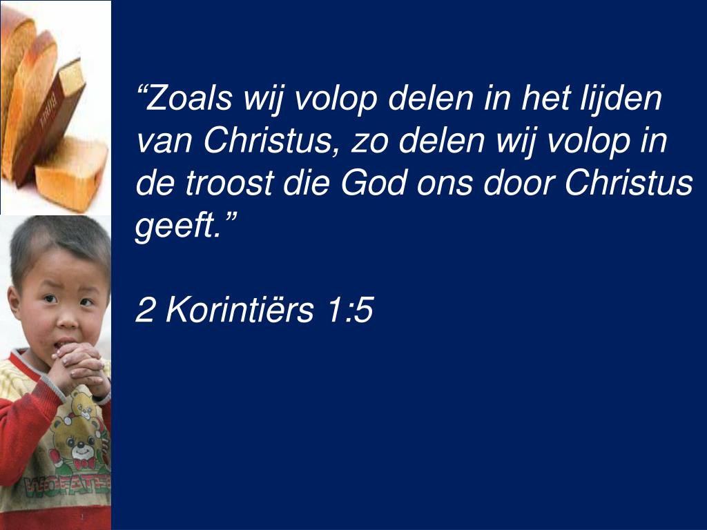 “Zoals wij volop delen in het lijden van Christus, zo delen wij volop in de troost die God ons door Christus geeft.” 2 Korintiërs 1:5