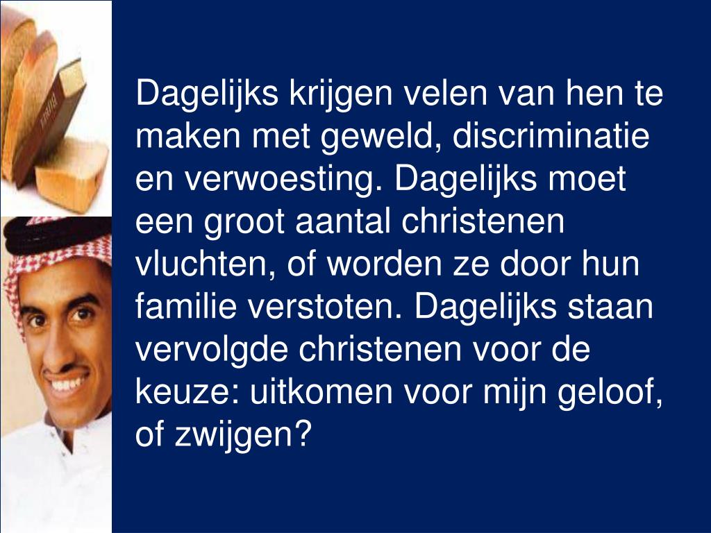Dagelijks krijgen velen van hen te maken met geweld, discriminatie en verwoesting. Dagelijks moet een groot aantal christenen vluchten, of worden ze door hun familie verstoten. Dagelijks staan vervolgde christenen voor de keuze: uitkomen voor mijn geloof, of zwijgen?