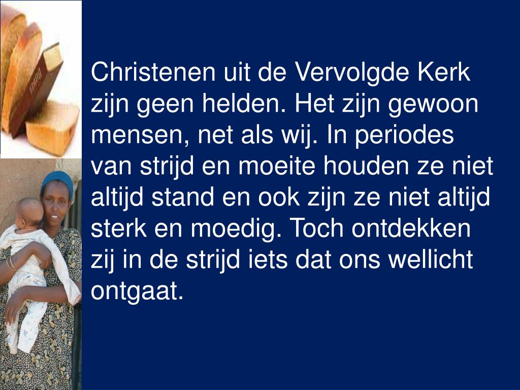 Christenen uit de Vervolgde Kerk zijn geen helden. Het zijn gewoon mensen, net als wij. In periodes van strijd en moeite houden ze niet altijd stand en ook zijn ze niet altijd sterk en moedig. Toch ontdekken zij in de strijd iets dat ons wellicht ontgaat.