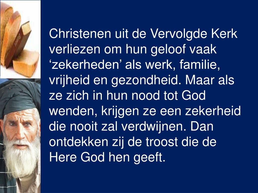 Christenen uit de Vervolgde Kerk verliezen om hun geloof vaak ‘zekerheden’ als werk, familie, vrijheid en gezondheid. Maar als ze zich in hun nood tot God wenden, krijgen ze een zekerheid die nooit zal verdwijnen. Dan ontdekken zij de troost die de Here God hen geeft.