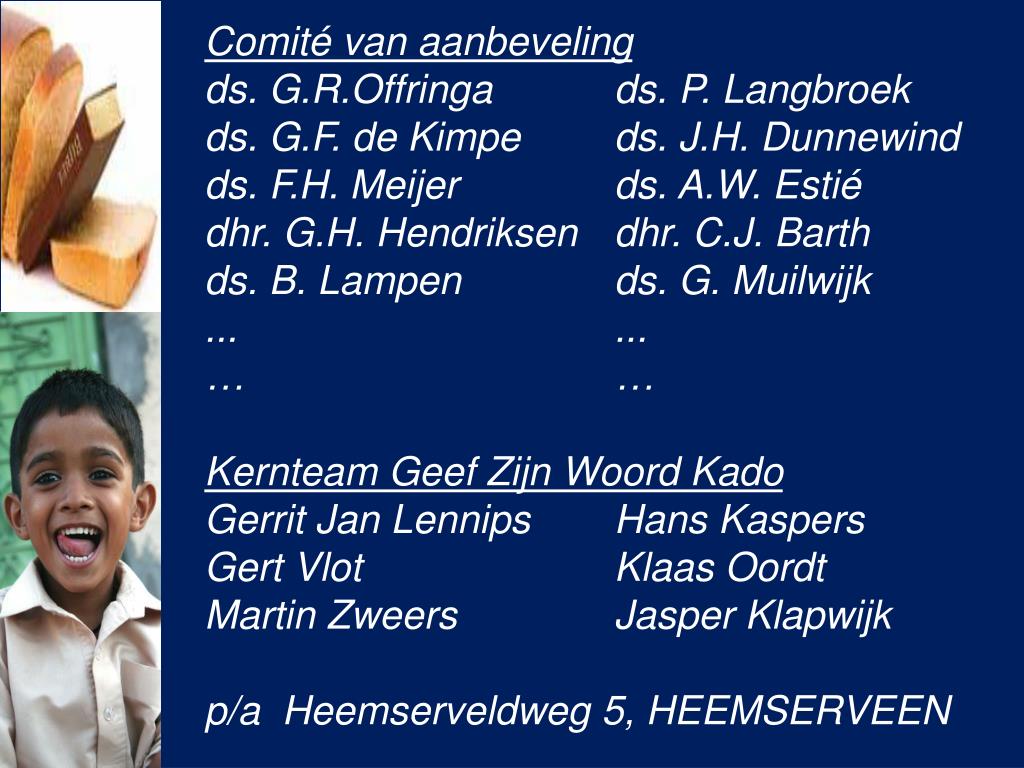 Comité van aanbeveling ds. G.R.Offringa ds. P. Langbroek ds. G.F. de Kimpe ds. J.H. Dunnewind ds. F.H. Meijer ds. A.W. Estié dhr. G.H. Hendriksen dhr. C.J. Barth ds. B. Lampen ds. G. Muilwijk ... ... … … Kernteam Geef Zijn Woord Kado Gerrit Jan Lennips Hans Kaspers Gert Vlot Klaas Oordt Martin Zweers Jasper Klapwijk p/a Heemserveldweg 5, HEEMSERVEEN