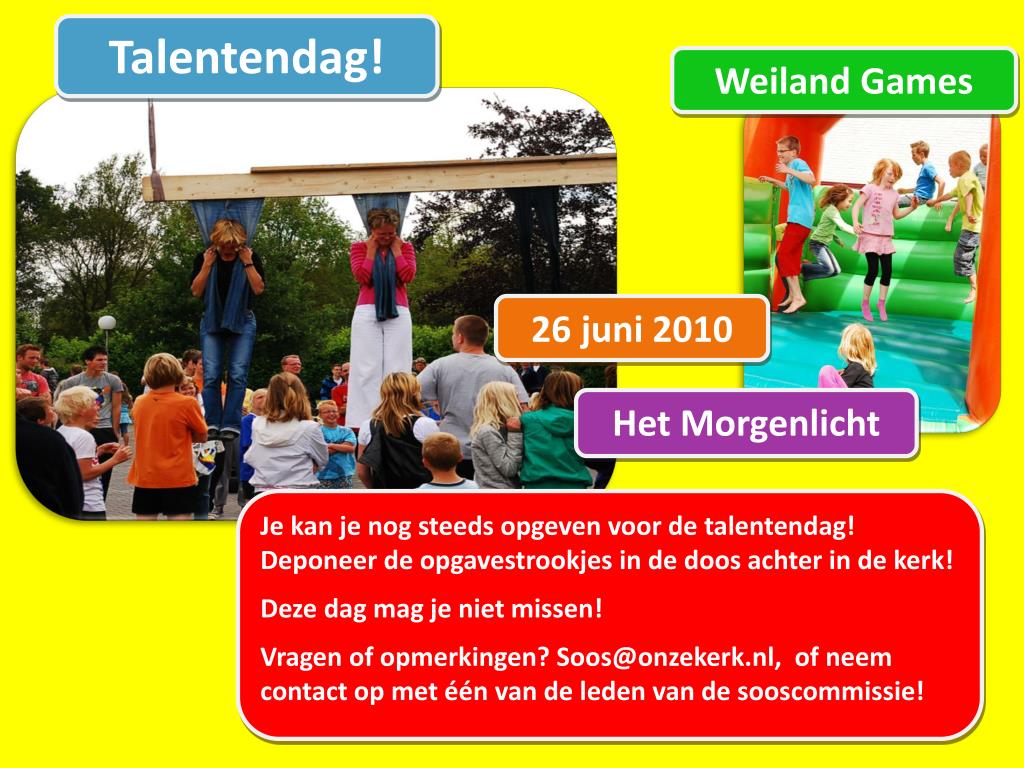 Talentendag! Weiland Games 26 juni 2010 Het Morgenlicht Je kan je nog steeds opgeven voor de talentendag! Deponeer de opgavestrookjes in de doos achter in de kerk! Deze dag mag je niet missen! Vragen of opmerkingen? Soos@onzekerk.nl, of neem contact op met één van de leden van de sooscommissie!