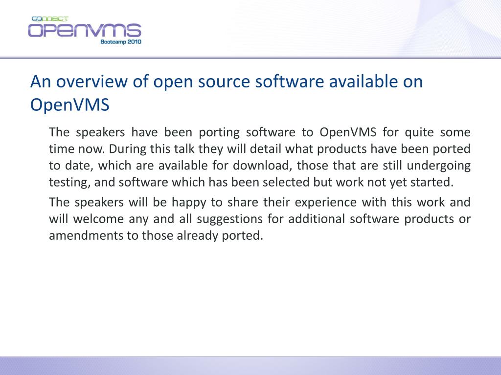An overview of open source software available on OpenVMS The speakers have been porting software to OpenVMS for quite some time now. During this talk they will detail what products have been ported to date, which are available for download, those that are still undergoing testing, and software which has been selected but work not yet started. The speakers will be happy to share their experience with this work and will welcome any and all suggestions for additional software products or amendments to those already ported.