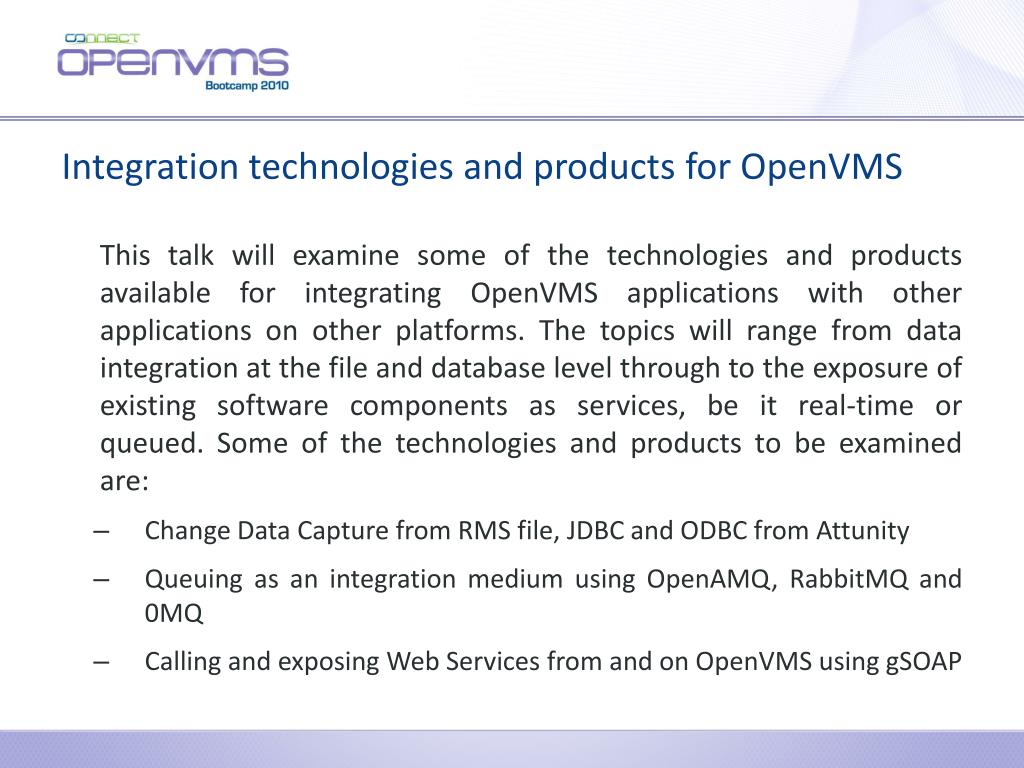 Integration technologies and products for OpenVMS This talk will examine some of the technologies and products available for integrating OpenVMS applications with other applications on other platforms. The topics will range from data integration at the file and database level through to the exposure of existing software components as services, be it real-time or queued. Some of the technologies and products to be examined are: • Change Data Capture from RMS file, JDBC and ODBC from Attunity • Queuing as an integration medium using OpenAMQ, RabbitMQ and 0MQ • Calling and exposing Web Services from and on OpenVMS using gSOAP