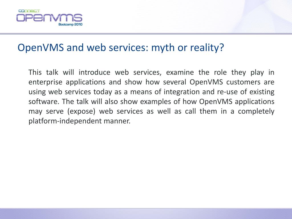 OpenVMS and web services: myth or reality? This talk will introduce web services, examine the role they play in enterprise applications and show how several OpenVMS customers are using web services today as a means of integration and re-use of existing software. The talk will also show examples of how OpenVMS applications may serve (expose) web services as well as call them in a completely platform-independent manner.