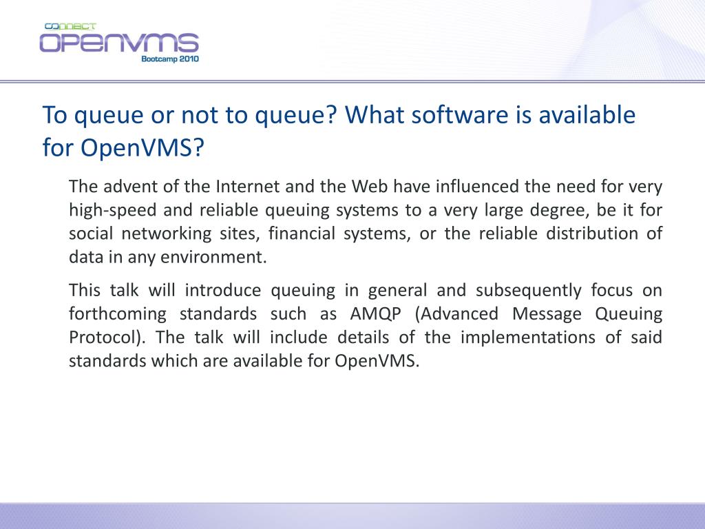 To queue or not to queue? What software is available for OpenVMS? The advent of the Internet and the Web have influenced the need for very high-speed and reliable queuing systems to a very large degree, be it for social networking sites, financial systems, or the reliable distribution of data in any environment. This talk will introduce queuing in general and subsequently focus on forthcoming standards such as AMQP (Advanced Message Queuing Protocol). The talk will include details of the implementations of said standards which are available for OpenVMS.
