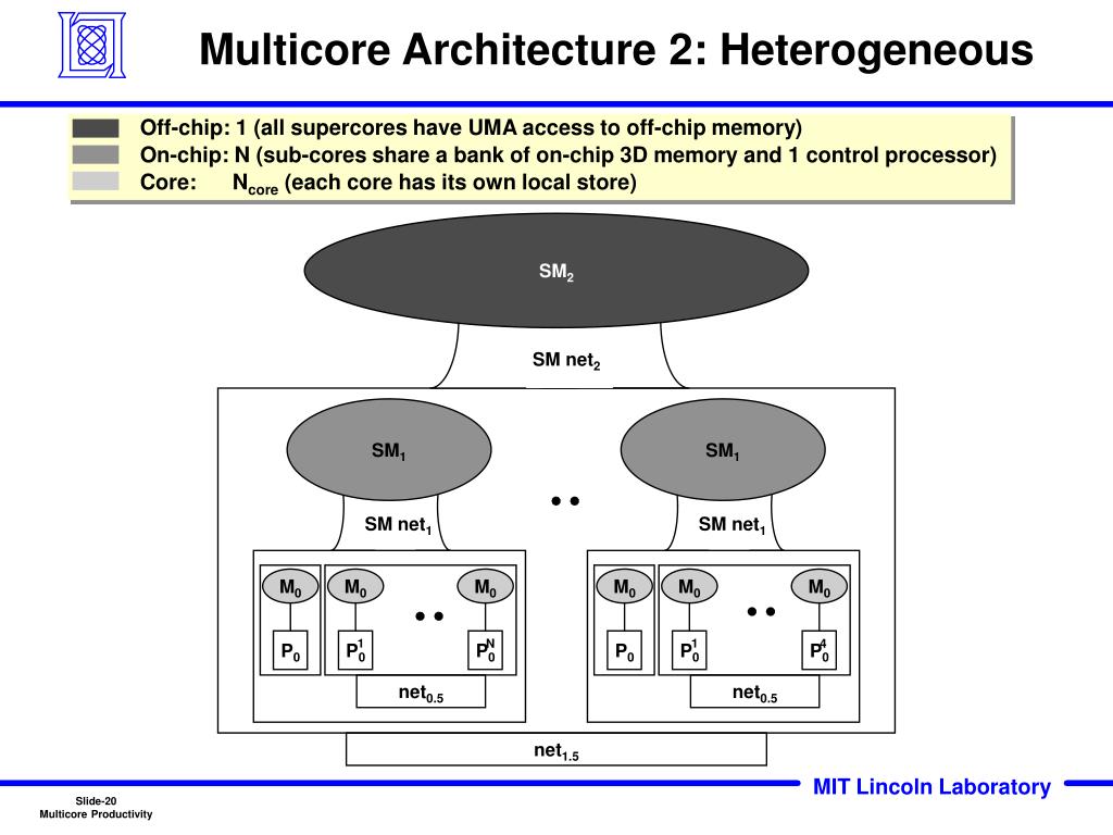 Multicore Architecture 1: Homogeneous • Off-chip: 1 (all cores have UMA access to off-chip memory) • On-chip: 1 (all cores have UMA access to on-chip 3D memory) • Core: Ncore (each core has its own cache) SM2 SM net2 SM1 SM net1 M0 M0 M0 M0 M0 63 0 1 2 3 P0 P0 P0 P0 P0 net0.5