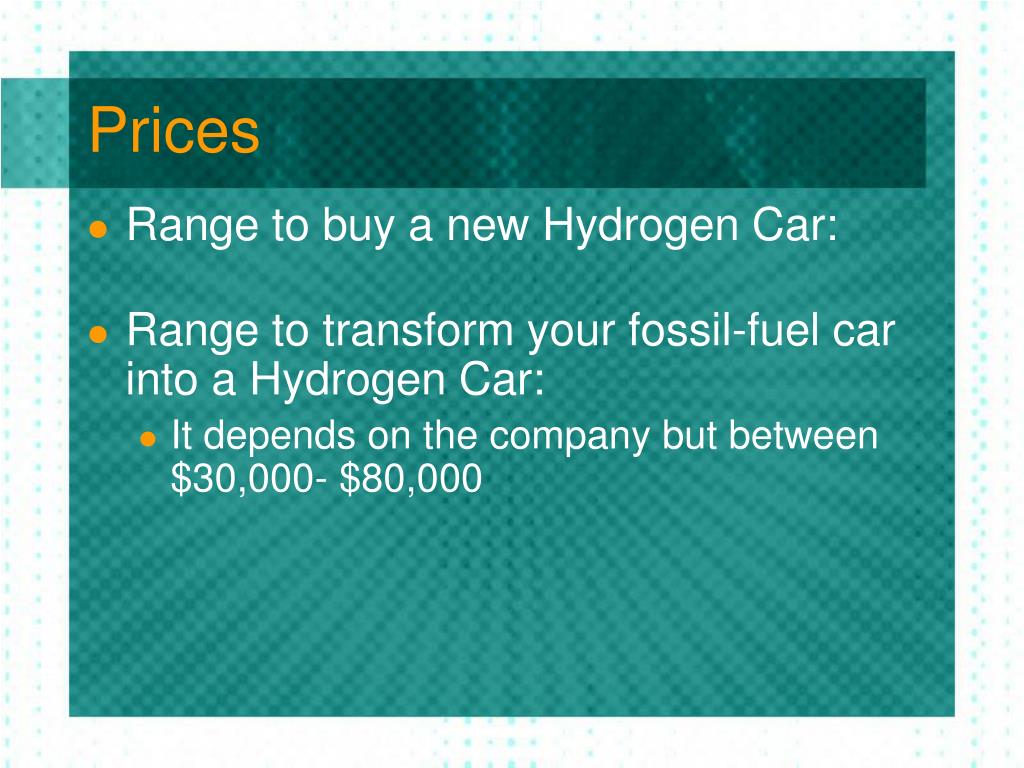 Prices • Range to buy a new Hydrogen Car: • Range to transform your fossil-fuel car into a Hydrogen Car: • It depends on the company but between $30,000- $80,000