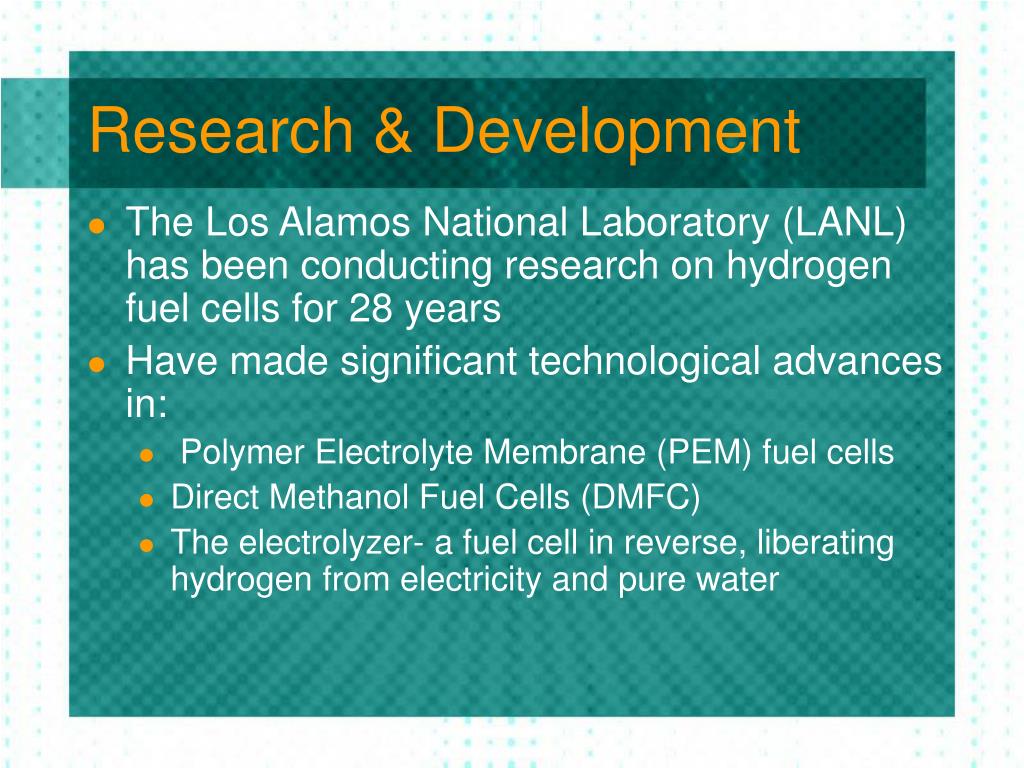 Research & Development • The Los Alamos National Laboratory (LANL) has been conducting research on hydrogen fuel cells for 28 years • Have made significant technological advances in: • Polymer Electrolyte Membrane (PEM) fuel cells • Direct Methanol Fuel Cells (DMFC) • The electrolyzer- a fuel cell in reverse, liberating hydrogen from electricity and pure water