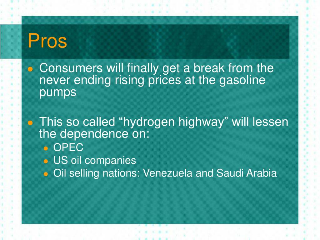 Pros • Consumers will finally get a break from the never ending rising prices at the gasoline pumps • This so called “hydrogen highway” will lessen the dependence on: • OPEC • US oil companies • Oil selling nations: Venezuela and Saudi Arabia