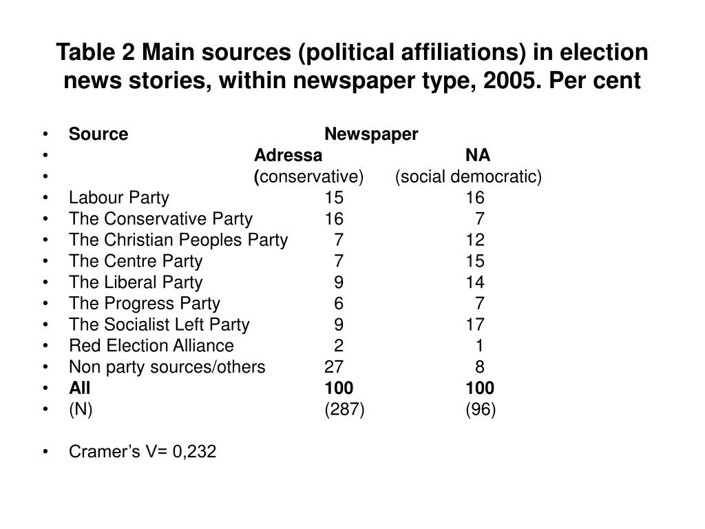 Table 2 Main sources (political affiliations) in election news stories, within newspaper type, 2005. Per cent • Source Newspaper • Adressa NA • (conservative) (social democratic) • Labour Party 15 16 • The Conservative Party 16 7 • The Christian Peoples Party 7 12 • The Centre Party 7 15 • The Liberal Party 9 14 • The Progress Party 6 7 • The Socialist Left Party 9 17 • Red Election Alliance 2 1 • Non party sources/others 27 8 • All 100 100 • (N) (287) (96) • Cramer’s V= 0,232