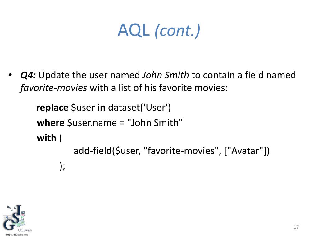 AQL (cont.) • Q4: Update the user named John Smith to contain a field named favorite-movies with a list of his favorite movies: replace $user in dataset('User') where $user.name = "John Smith" with ( add-field($user, "favorite-movies", ["Avatar"]) );