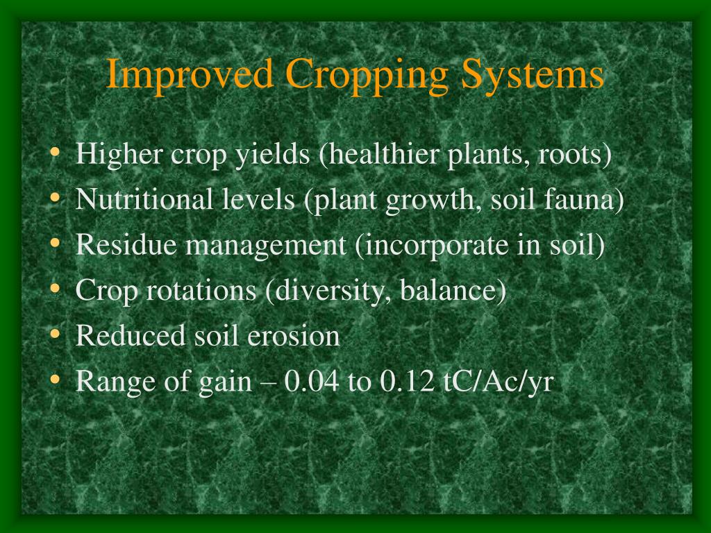 Improved Cropping Systems • Higher crop yields (healthier plants, roots) • Nutritional levels (plant growth, soil fauna) • Residue management (incorporate in soil) • Crop rotations (diversity, balance) • Reduced soil erosion • Range of gain – 0.04 to 0.12 tC/Ac/yr