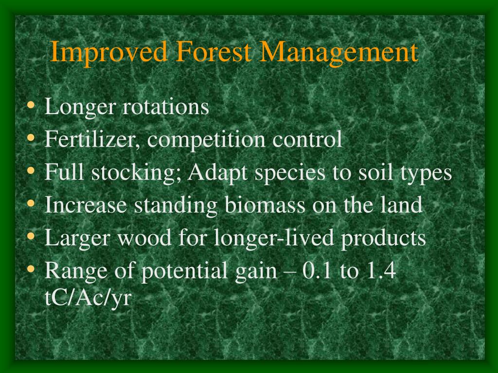 Improved Forest Management • Longer rotations • Fertilizer, competition control • Full stocking; Adapt species to soil types • Increase standing biomass on the land • Larger wood for longer-lived products • Range of potential gain – 0.1 to 1.4 tC/Ac/yr