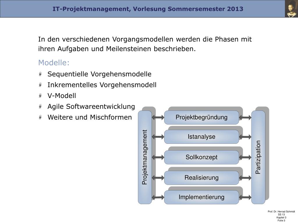 IT-Projektmanagement SS 2013 Prof. Dr. Herrad Schmidt. Kapitel 3 Vorgehensmodelle. Die Prozessschritte zur Realisierung eines IT-Projektes, insbesondere eines Entwicklungs- oder Auswahlprojekts, müssen systematisiert und strukturiert ablaufen.