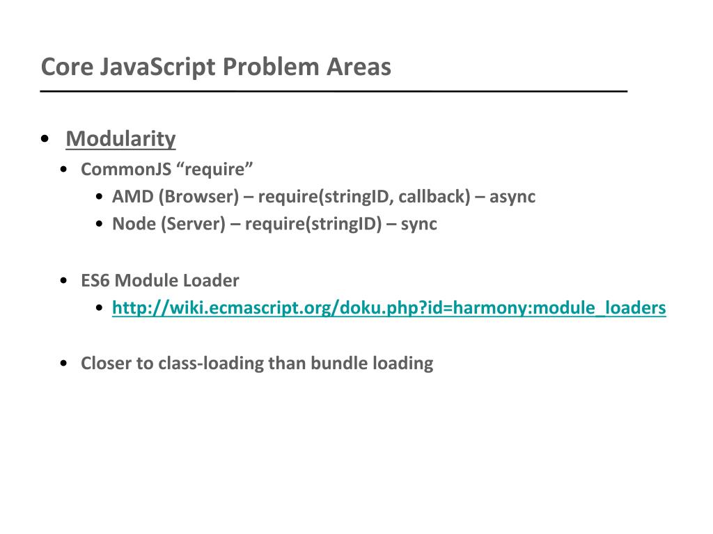 Core JavaScript Problem Areas • Modularity • CommonJS “require” • AMD (Browser) – require(stringID, callback) – async • Node (Server) – require(stringID) – sync • ES6 Module Loader • http://wiki.ecmascript.org/doku.php?id=harmony:module_loaders • Closer to class-loading than bundle loading