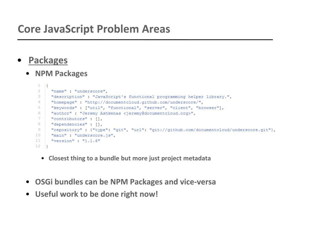 Core JavaScript Problem Areas • Packages • NPM Packages • Closest thing to a bundle but more just project metadata • OSGi bundles can be NPM Packages and vice-versa • Useful work to be done right now!