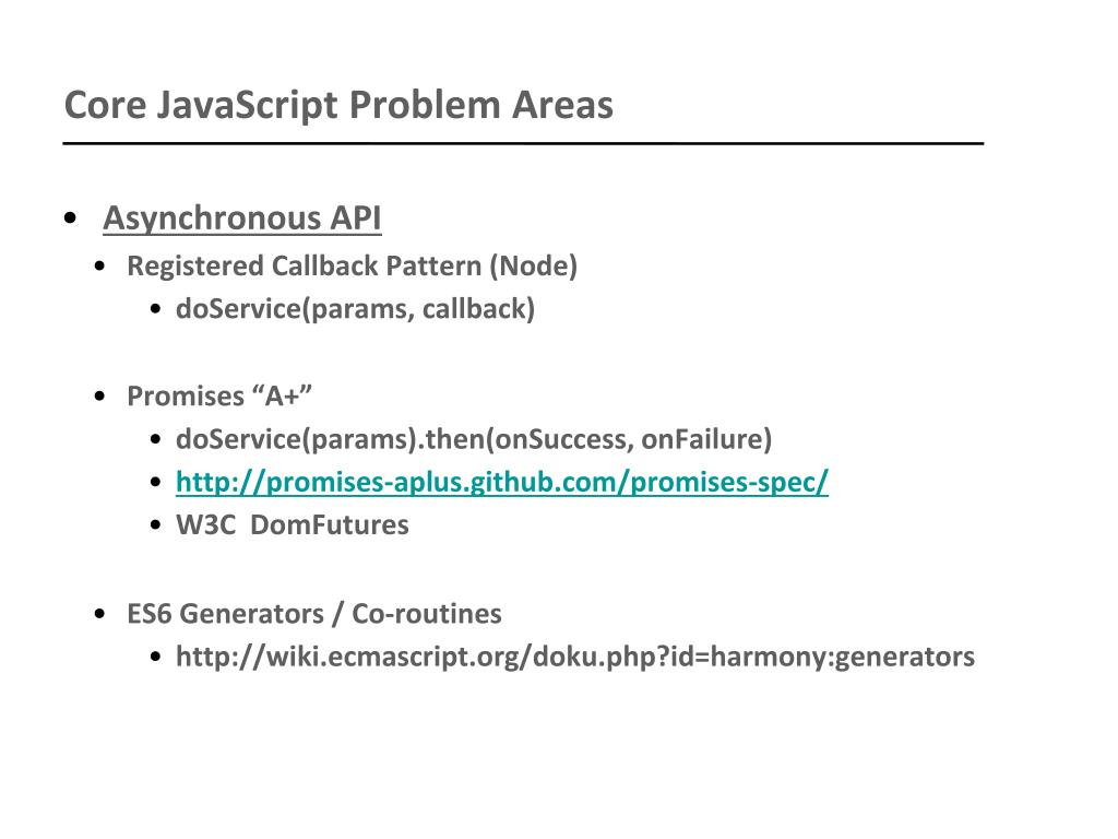 Core JavaScript Problem Areas • Asynchronous API • Registered Callback Pattern (Node) • doService(params, callback) • Promises “A+” • doService(params).then(onSuccess, onFailure) • http://promises-aplus.github.com/promises-spec/ • W3C DomFutures • ES6 Generators / Co-routines • http://wiki.ecmascript.org/doku.php?id=harmony:generators