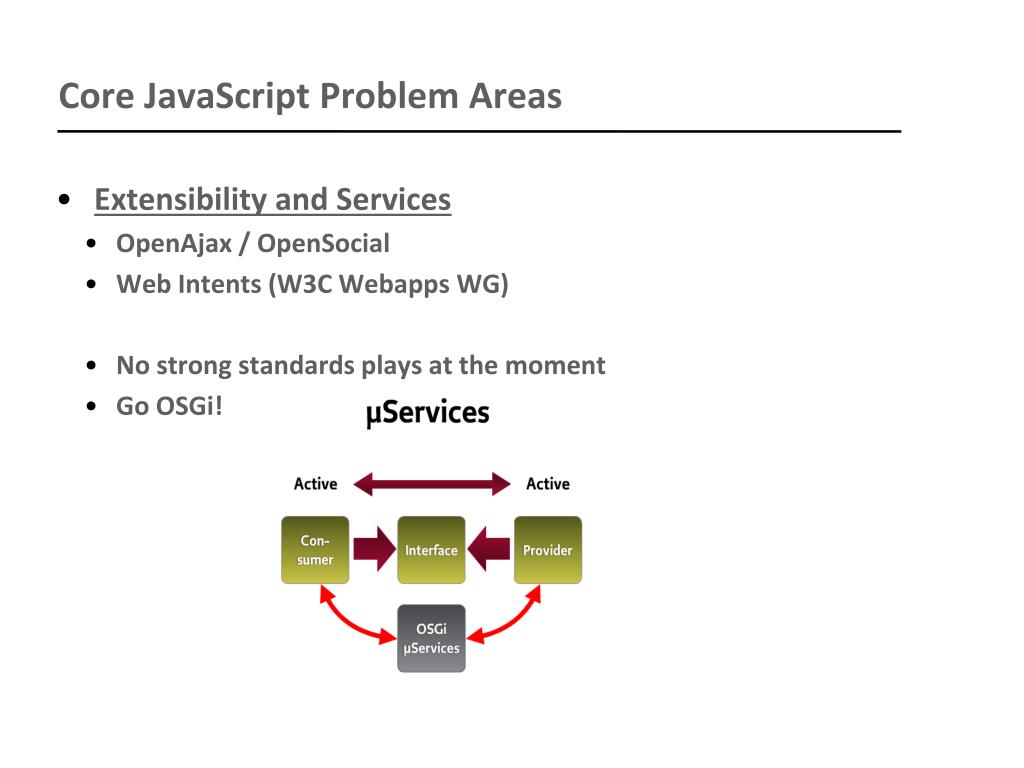 Core JavaScript Problem Areas • Extensibility and Services • OpenAjax / OpenSocial • Web Intents (W3C Webapps WG) • No strong standards plays at the moment • Go OSGi!
