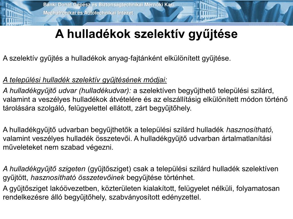 Bánki Donát Gépész és Biztonságtechnikai Mérnöki KarMechatronikai és Autótechnikai Intézet A hulladékok szelektív gyűjtése A szelektív gyűjtés a hulladékok anyag-fajtánként elkülönített gyűjtése. A települési hulladék szelektív gyűjtésének módjai: A hulladékgyűjtő udvar (hulladékudvar): a szelektíven begyűjthető települési szilárd, valamint a veszélyes hulladékok átvételére és az elszállításig elkülönített módon történő tárolására szolgáló, felügyelettel ellátott, zárt begyűjtőhely. A hulladékgyűjtő udvarban begyűjthetők a települési szilárd hulladék hasznosítható, valamint veszélyes hulladék összetevői. A hulladékgyűjtő udvarban ártalmatlanítási műveleteket nem szabad végezni. A hulladékgyűjtő szigeten (gyűjtősziget) csak a települési szilárd hulladék szelektíven gyűjtött, hasznosítható összetevőinek begyűjtése történhet. A gyűjtősziget lakóövezetben, közterületen kialakított, felügyelet nélküli, folyamatosan rendelkezésre álló begyűjtőhely, szabványosított edényzettel.