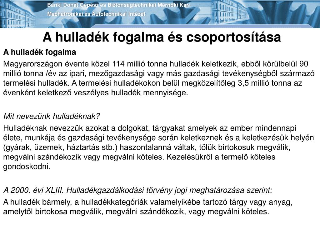 Bánki Donát Gépész és Biztonságtechnikai Mérnöki KarMechatronikai és Autótechnikai Intézet A hulladék fogalma és csoportosítása A hulladék fogalma Magyarországon évente közel 114 millió tonna hulladék keletkezik, ebből körülbelül 90 millió tonna /év az ipari, mezőgazdasági vagy más gazdasági tevékenységből származó termelési hulladék. A termelési hulladékokon belül megközelítőleg 3,5 millió tonna az évenként keletkező veszélyes hulladék mennyisége. Mit nevezünk hulladéknak? Hulladéknak nevezzük azokat a dolgokat, tárgyakat amelyek az ember mindennapi élete, munkája és gazdasági tevékenysége során keletkeznek és a keletkezésük helyén (gyárak, üzemek, háztartás stb.) haszontalanná váltak, tőlük birtokosuk megválik, megválni szándékozik vagy megválni köteles. Kezelésükről a termelő köteles gondoskodni. A 2000. évi XLIII. Hulladékgazdálkodási törvény jogi meghatározása szerint: A hulladék bármely, a hulladékkategóriák valamelyikébe tartozó tárgy vagy anyag, amelytől birtokosa megválik, megválni szándékozik, vagy megválni köteles.