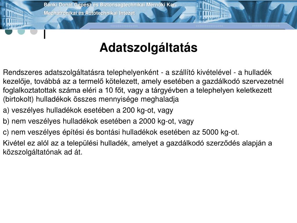Bánki Donát Gépész és Biztonságtechnikai Mérnöki KarMechatronikai és Autótechnikai Intézet Adatszolgáltatás Rendszeres adatszolgáltatásra telephelyenként - a szállító kivételével - a hulladék kezelője, továbbá az a termelő kötelezett, amely esetében a gazdálkodó szervezetnél foglalkoztatottak száma eléri a 10 főt, vagy a tárgyévben a telephelyen keletkezett (birtokolt) hulladékok összes mennyisége meghaladja a) veszélyes hulladékok esetében a 200 kg-ot, vagy b) nem veszélyes hulladékok esetében a 2000 kg-ot, vagy c) nem veszélyes építési és bontási hulladékok esetében az 5000 kg-ot. Kivétel ez alól az a települési hulladék, amelyet a gazdálkodó szerződés alapján a közszolgáltatónak ad át.