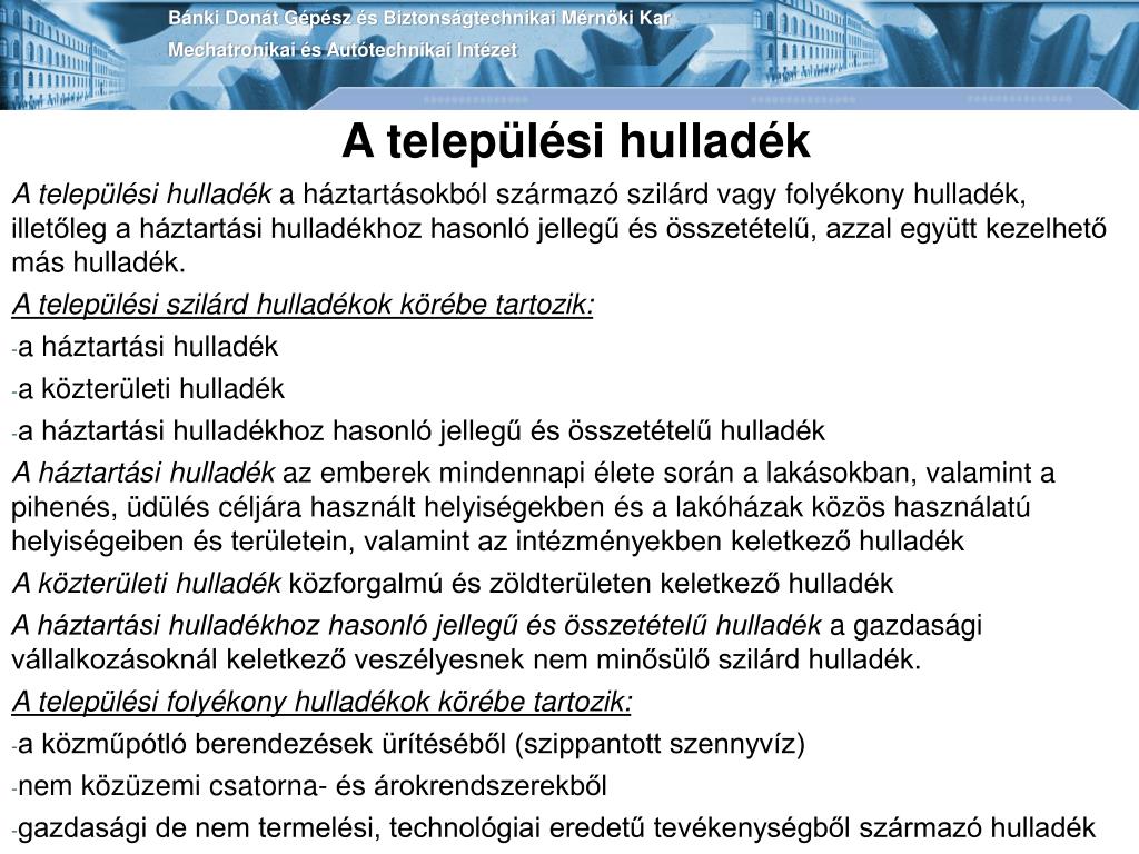 Bánki Donát Gépész és Biztonságtechnikai Mérnöki KarMechatronikai és Autótechnikai Intézet A települési hulladék A települési hulladék a háztartásokból származó szilárd vagy folyékony hulladék, illetőleg a háztartási hulladékhoz hasonló jellegű és összetételű, azzal együtt kezelhető más hulladék. A települési szilárd hulladékok körébe tartozik: • a háztartási hulladék • a közterületi hulladék • a háztartási hulladékhoz hasonló jellegű és összetételű hulladék A háztartási hulladék az emberek mindennapi élete során a lakásokban, valamint a pihenés, üdülés céljára használt helyiségekben és a lakóházak közös használatú helyiségeiben és területein, valamint az intézményekben keletkező hulladék A közterületi hulladék közforgalmú és zöldterületen keletkező hulladék A háztartási hulladékhoz hasonló jellegű és összetételű hulladék a gazdasági vállalkozásoknál keletkező veszélyesnek nem minősülő szilárd hulladék. A települési folyékony hulladékok körébe tartozik: • a közműpótló berendezések ürítéséből (szippantott szennyvíz) • nem közüzemi csatorna- és árokrendszerekből • gazdasági de nem termelési, technológiai eredetű tevékenységből származó hulladék