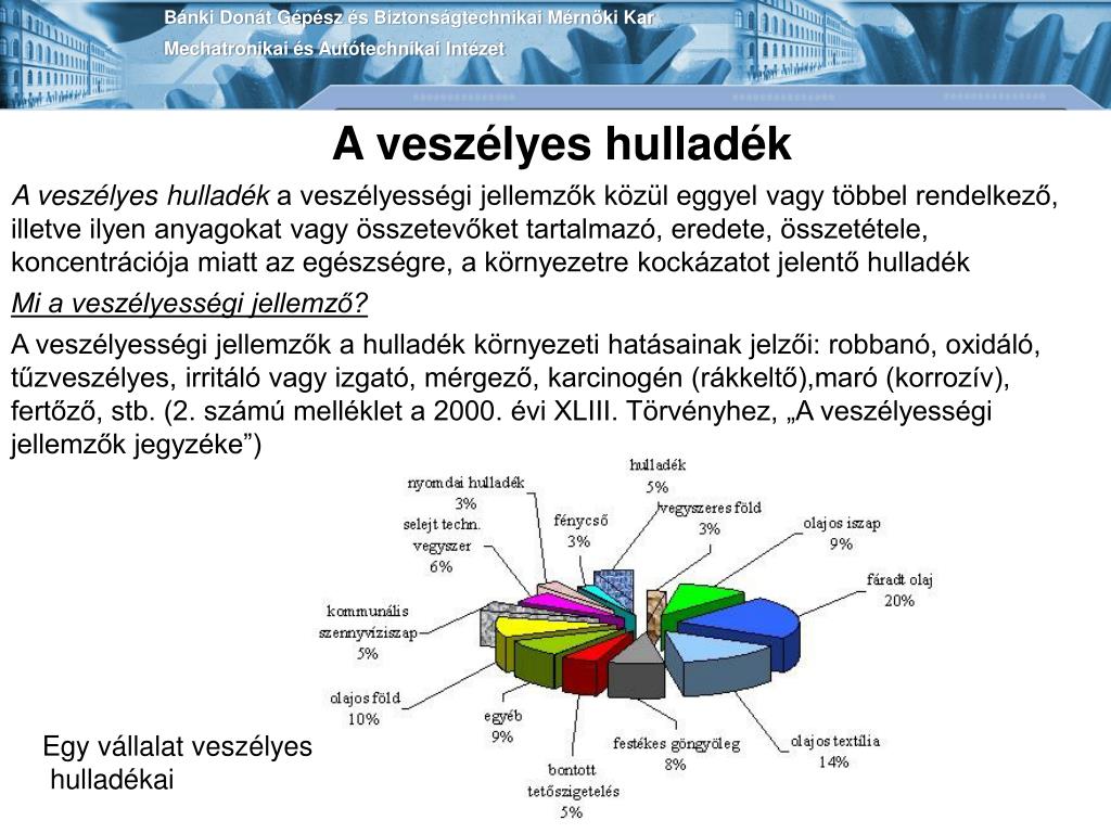 Bánki Donát Gépész és Biztonságtechnikai Mérnöki KarMechatronikai és Autótechnikai Intézet A veszélyes hulladék A veszélyes hulladék a veszélyességi jellemzők közül eggyel vagy többel rendelkező, illetve ilyen anyagokat vagy összetevőket tartalmazó, eredete, összetétele, koncentrációja miatt az egészségre, a környezetre kockázatot jelentő hulladék Mi a veszélyességi jellemző? A veszélyességi jellemzők a hulladék környezeti hatásainak jelzői: robbanó, oxidáló, tűzveszélyes, irritáló vagy izgató, mérgező, karcinogén (rákkeltő),maró (korrozív), fertőző, stb. (2. számú melléklet a 2000. évi XLIII. Törvényhez, „A veszélyességi jellemzők jegyzéke”) Egy vállalat veszélyes hulladékai