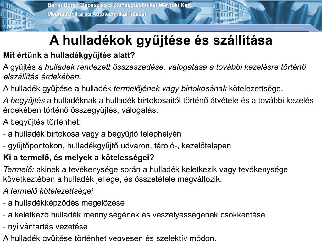 Bánki Donát Gépész és Biztonságtechnikai Mérnöki KarMechatronikai és Autótechnikai Intézet A hulladékok gyűjtése és szállítása Mit értünk a hulladékgyűjtés alatt? A gyűjtés a hulladék rendezett összeszedése, válogatása a további kezelésre történő elszállítás érdekében. A hulladék gyűjtése a hulladék termelőjének vagy birtokosának kötelezettsége. A begyűjtés a hulladéknak a hulladék birtokosaitól történő átvétele és a további kezelés érdekében történő összegyűjtés, válogatás. A begyűjtés történhet: - a hulladék birtokosa vagy a begyűjtő telephelyén - gyűjtőpontokon, hulladékgyűjtő udvaron, tároló-, kezelőtelepen Ki a termelő, és melyek a kötelességei? Termelő: akinek a tevékenysége során a hulladék keletkezik vagy tevékenysége következtében a hulladék jellege, és összetétele megváltozik. A termelő kötelezettségei - a hulladékképződés megelőzése - a keletkező hulladék mennyiségének és veszélyességének csökkentése - nyilvántartás vezetése A hulladék gyűjtése történhet vegyesen és szelektív módon.