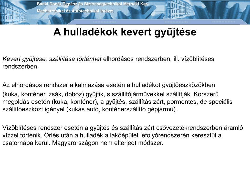Bánki Donát Gépész és Biztonságtechnikai Mérnöki KarMechatronikai és Autótechnikai Intézet A hulladékok kevert gyűjtése Kevert gyűjtése, szállítása történhet elhordásos rendszerben, ill. vízöblítéses rendszerben. Az elhordásos rendszer alkalmazása esetén a hulladékot gyűjtőeszközökben (kuka, konténer, zsák, doboz) gyűjtik, s szállítójárművekkel szállítják. Korszerű megoldás esetén (kuka, konténer), a gyűjtés, szállítás zárt, pormentes, de speciális szállítóeszközt igényel (kukás autó, konténerszállító gépjármű). Vízöblítéses rendszer esetén a gyűjtés és szállítás zárt csővezetékrendszerben áramló vízzel történik. Őrlés után a hulladék a lakóépület lefolyórendszerén keresztül a csatornába kerül. Magyarországon nem elterjedt módszer.