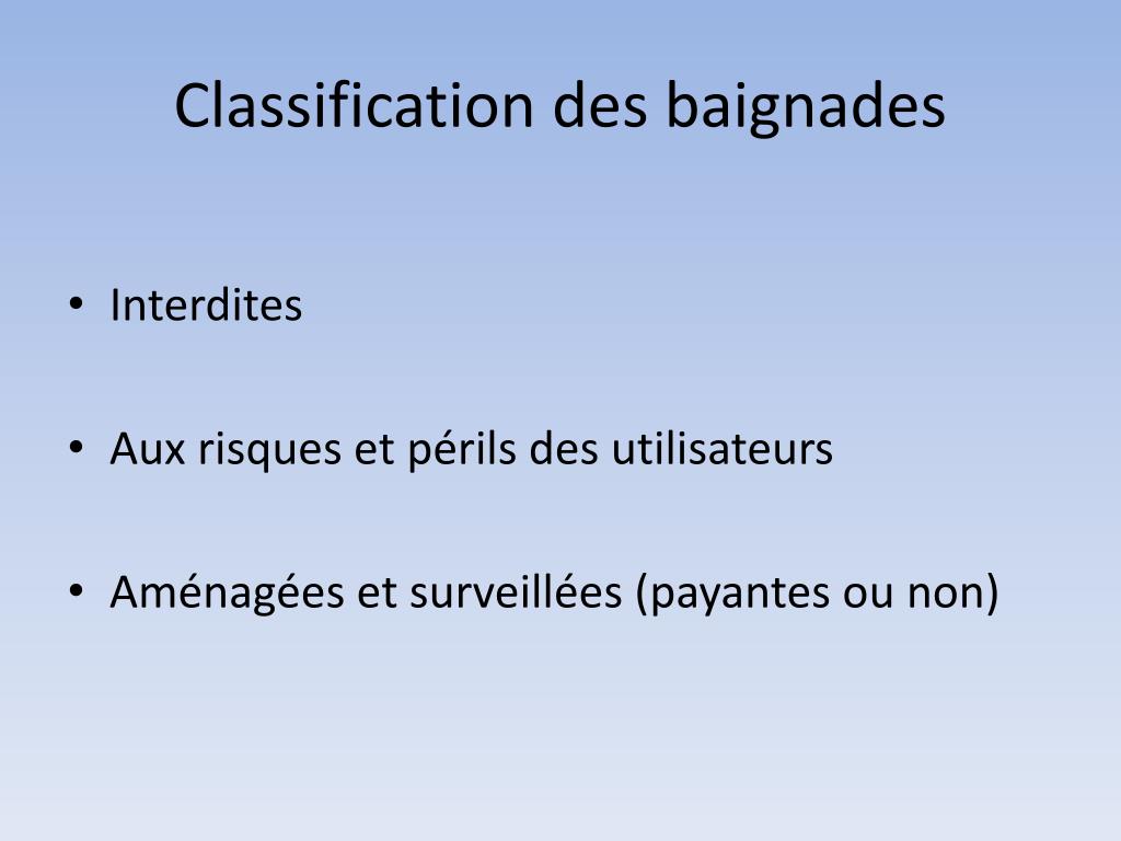 Classification des baignades • Interdites • Aux risques et périls des utilisateurs • Aménagées et surveillées (payantes ou non)