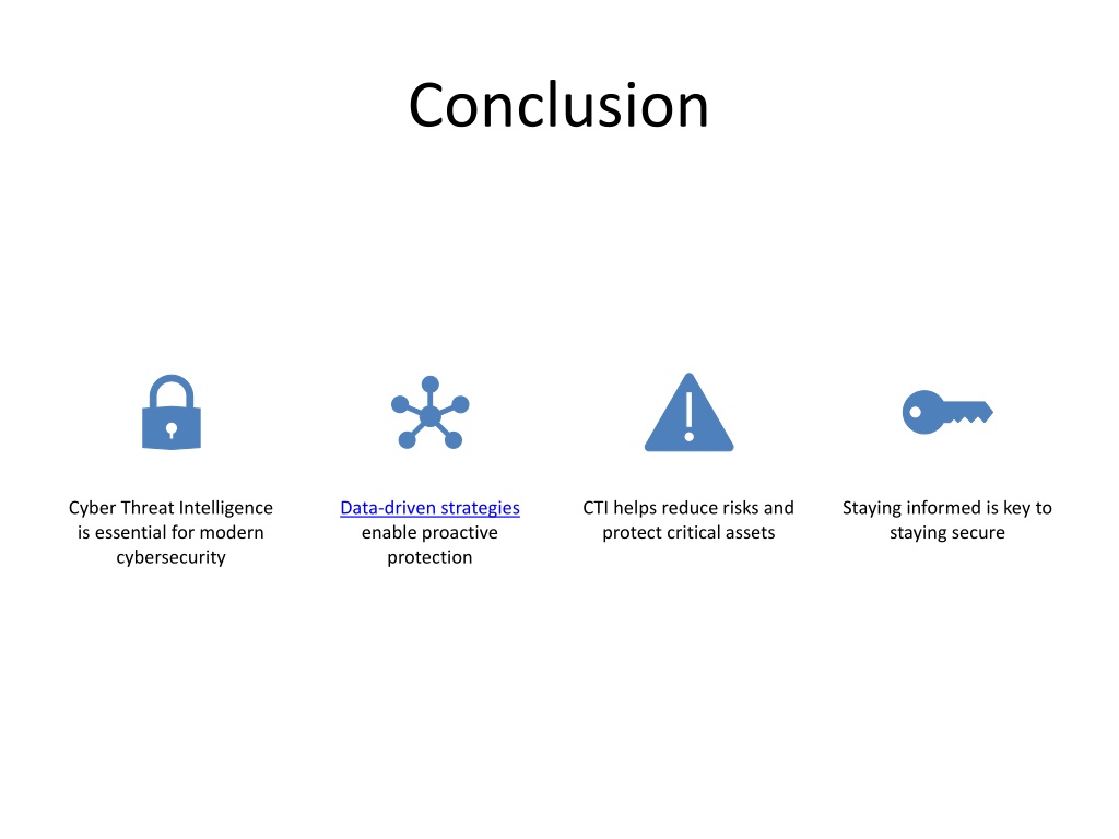 9. CTI and Strategic Decision-Making • Provides insights for security investments • Helps identify high-risk systems and processes • Supports compliance and governance goals • Aligns security strategy with business objectives