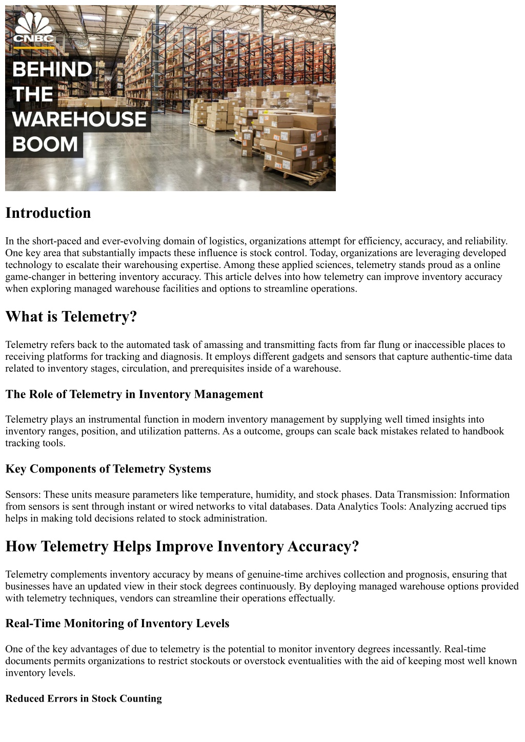 Manual counting equipment by and large bring about human mistakes, resulting in inaccuracies in inventory files. With telemetry approaches in vicinity, discrepancies among recorded and precise inventory ranges can be diagnosed unexpectedly. Improved Supply Chain Visibility Telemetry offers cease-to-end warehouse management services aerodoc visibility across the offer chain. Organizations can track their merchandise from suppliers by way of warehouses to shoppers seamlessly. Enhanced Decision Making with Data Analytics Telemetry techniques usally come provided with mighty analytics instruments that study tendencies and patterns in stock utilization. This data facilitates managers to make details-driven choices approximately restocking options. Managed Warehouse Services: The Perfect Companion for Telemetry To maximize the merits of telemetry science, integrating it with controlled warehouse expertise can yield widespread enhancements in inventory administration. What are Managed Warehouse Services? Managed warehouse services contain outsourcing warehousing capabilities to 3rd-party providers who specialise in optimizing garage space and editing operational efficiency. Benefits of Partnering with Managed Warehouse Providers Access to specialized expertise Cost-constructive solutions Scalability consistent with commercial enterprise needs Combining Telemetry with Managed Warehouse Solutions By combining telemetry with controlled warehouse answers, corporations can gain extraordinary accuracy in their stock strategies. For occasion: Automated Replenishment: Using genuine-time statistics from telemetry tactics helps well timed replenishment based totally on factual demand. Optimized Storage Layouts: Managed warehouse vendors use telemetry documents to research house utilization appropriately, premier to more desirable group in the facility. Key Metrics for Measuring Inventory Accuracy with Telemetry When utilising telemetry for dealing with inventories, convinced metrics turned into major for measuring achievement: 1. Inventory Turnover Ratio This metric shows how typically a visitors sells its overall inventory in the course of a specific period. 2. Stockout Rate This measures how sometimes gadgets are out of stock when customers prefer them—shrink charges suggest more advantageous efficiency. three. Fill Rate Fill price evaluates the share of customer call for met devoid of backorders or delays; larger percentages reflect greater precise inventories. Challenges Associated with Implementing Telemetry Solutions
