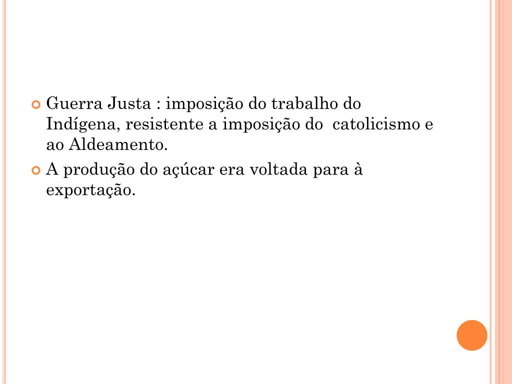 Guerra Justa : imposição do trabalho do Indígena, resistente a imposição do catolicismo e ao Aldeamento. • A produção do açúcar era voltada para à exportação.