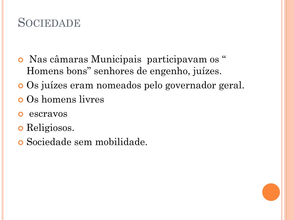 Sociedade • Nas câmaras Municipais participavam os “ Homens bons” senhores de engenho, juízes. • Os juízes eram nomeados pelo governador geral. • Os homens livres • escravos • Religiosos. • Sociedade sem mobilidade.